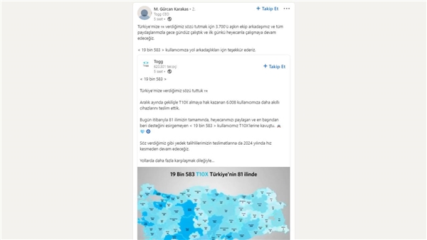 Bu başarının ardından Togg CEO’su Gürcan Karakaş, Linkedin hesabı üzerinden bir paylaşım yaptı ve şunları söyledi: